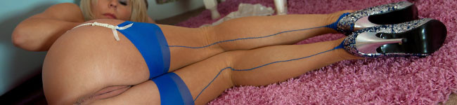 Sexy MILF Jan Burton with big boobs and increible long legs wanks in blue Seamed stockings