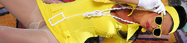 Now that is what we call summer colours! See Eve in a sexy yellow retro style dress with white Falke pantyhose and sexy yellow boots!