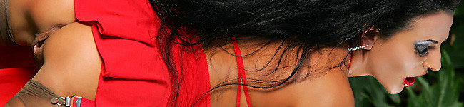 Pink looks so sexy and seductive on Eve with her tanned skin and her black hair! See Eve at the garden, wearing some sheer seamed pink stockings, a corset and a matching dress with mules!