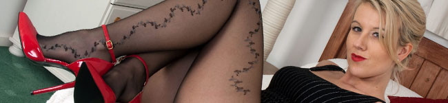 Horny Housewife Emma Bates with perfect body and long legs looks sexy in red Lingerie, seamed stockings and Porn Heels.