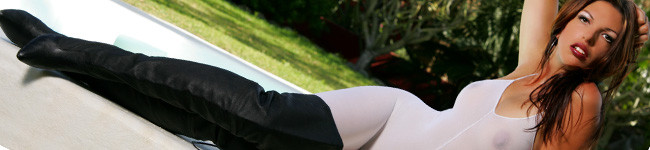Sexy Venus Black is wearing a white catsuit and a pair of black leather boots. See her at the pool showing her perfect and well shaped body and see her breasts and hot boobs covered from the white catsuit!