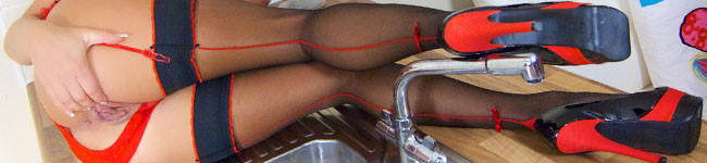 Kitchen Fun with horny blonde housewife MichelleThorne in sexy black and red Lingerie and Plateau Heels.