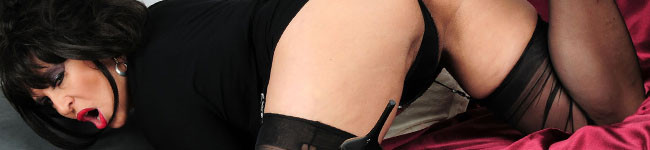 Horny Housewife Amanda Moreno in black velvet dress and seamed stockings.