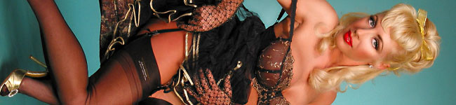 Lady Gina brings back the swinging fifties wearing a tight corset and the petticoat with the dot skirt. Get teased by lady Gina and her well shaped legs in black stockings.