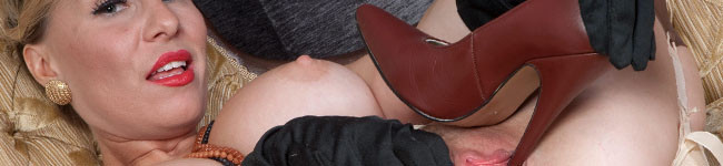 Busty Blonde Lavienne is showing her legs and posing sexy for you on the sofa. See her wearing a black corset and black seamed stockings and starting working her tits and pussy.