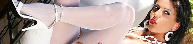 Eve loves to be at the garden and white is the perfect colour to wear on a hot summer day. See Eve wearing a garter belt pantyhose over a pair of white tights. Her feets are in some very sexy white sandales!